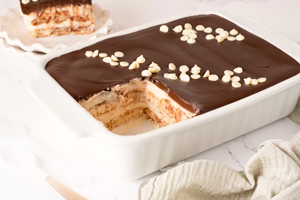 - Cubrimos el pavê brasileño con una capa de chocolate, lo dejamos en la nevera y lo servimos frío
